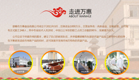 邯鄲市萬惠食品有限公司成立于2011年3月,2014年8月動工興建,2016年12月完成建設(shè)任務,公司占地32畝,建筑面積1.2萬平方米,其中生產(chǎn)廠房5000平方米,倉儲5000平方米。2017年2月購進原料清洗設(shè)備、烘焙設(shè)備、包裝設(shè)備等生產(chǎn)線2條,是一家專業(yè)生產(chǎn)肉脯、豆制品、鹵制品的專業(yè)生產(chǎn)企業(yè)。