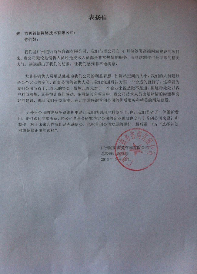 日前,我公司收到道衍商務(wù)咨詢(xún)有限公司的表?yè)P(yáng)信,在信中對(duì)首創(chuàng)公司的網(wǎng)站建設(shè)和服務(wù)給予了充分肯定和表?yè)P(yáng)。我們也感謝道衍公司的表?yè)P(yáng),我們會(huì)繼續(xù)堅(jiān)持為新老客戶(hù)提供優(yōu)質(zhì)的服務(wù),也希望在未來(lái)的道路上,與道衍公司合作的更加完好。